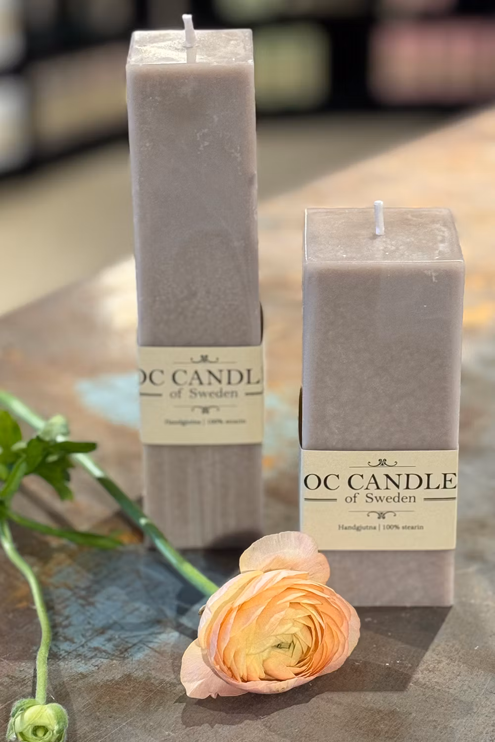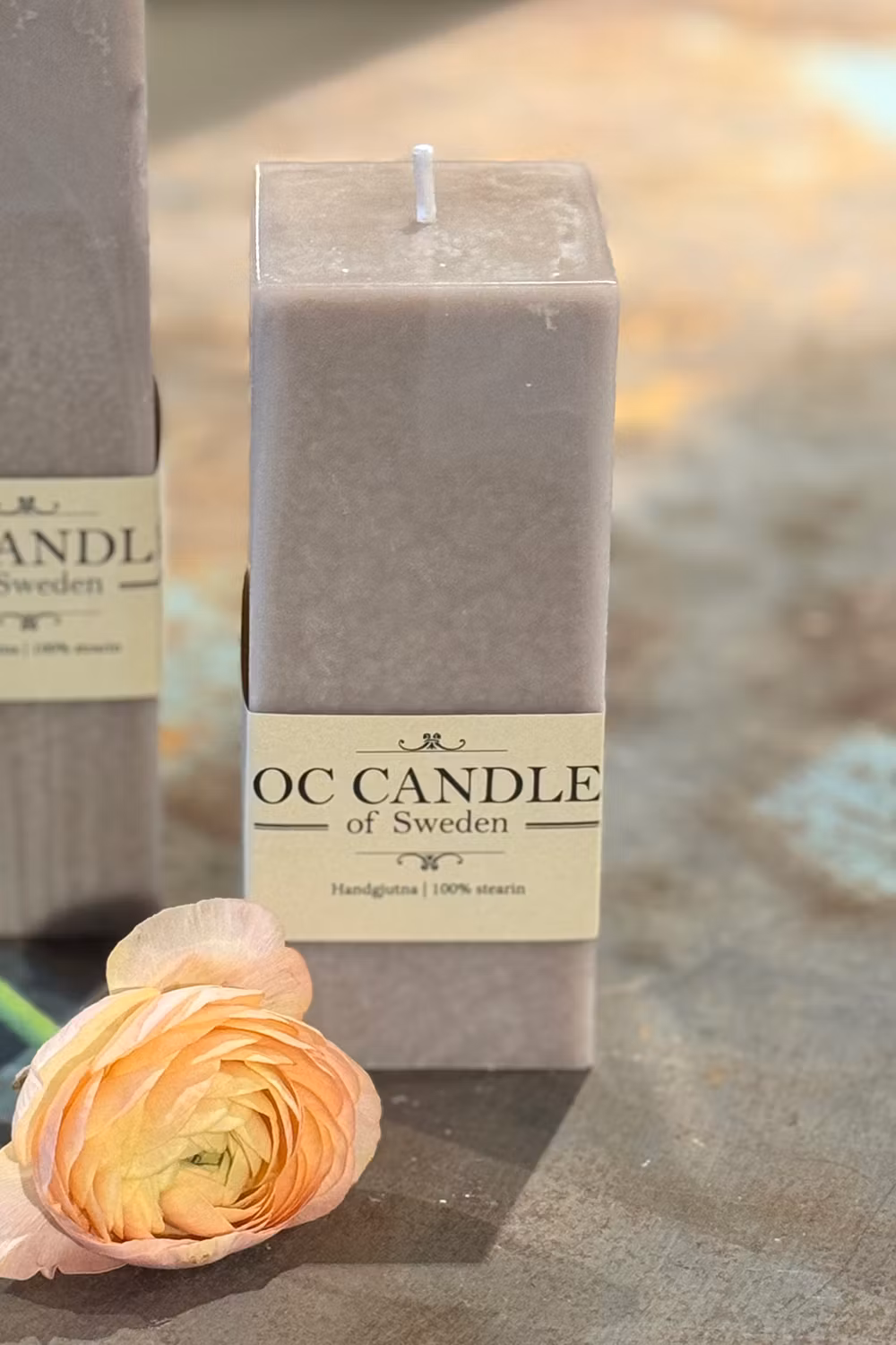 Ett fantastiskt blockljus med kvadratisk form. När det brinner smälter hörnen ner sist vilket gör att det oftast bildas ett vackert nätmönster. Gjuts för hand i 100% stearin, med bomullsveke.