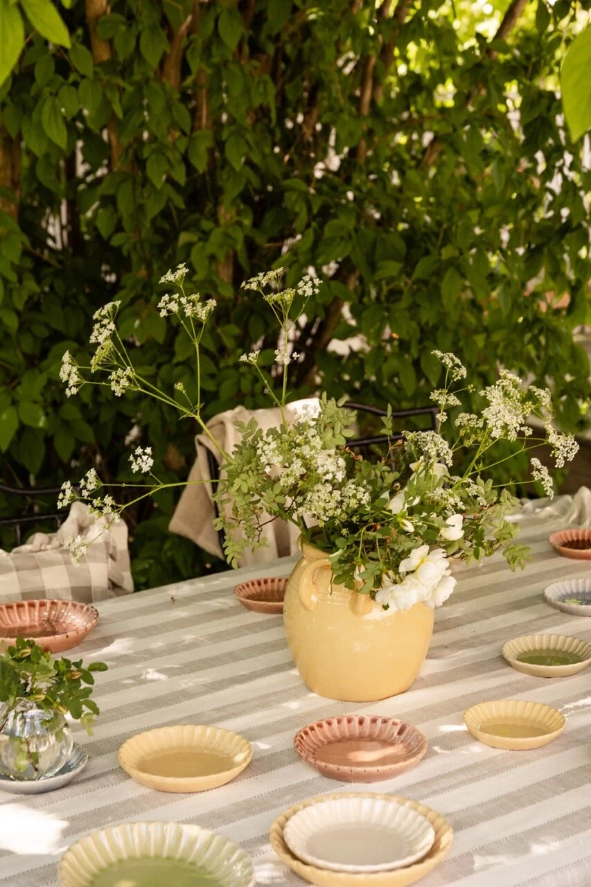 Fat i stengods med fint reliefmönster och handglaserad i en fin askrosa nyans. De naturliga skiftningarna i glasyren ger liv till faten som är fina att gruppera i olika storlekar och färger. Kan t.ex. användas som ljusfat eller som ett vackert underlägg för växter och krukor. Då fatet är handgjort kan prickar eller rinnränder i glasyren förekomma.